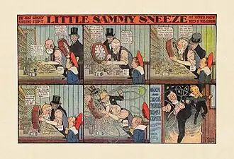 Little Sammy Sneeze was a comic strip by American cartoonist Winsor McCay. In each episode the titular Sammy sneezed himself into an awkward or disastrous predicament. The strip ran from July 24, 1904 until at least May 26, 1907[1] in the New York Herald, where McCay was on the staff. It was McCay's first successful comic strip; he followed it with Dream of the Rarebit Fiend later in 1904, and his best-known strip Little Nemo in Slumberland in 1905.