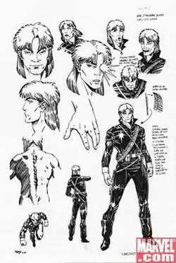 A design for the character of Longshot was put forward by Carl Potts, who outfitted the character in a jumpsuit that Adams thought to be reminiscent of the Starfleet uniforms from Star Trek: The Motion Picture.[2] Nocenti suggested that Longshot look distinct from other superheroes. She prescribed that he be an alien, have only four fingers on each hand, and has an unusual spine, though this last trait was not mentioned in the comics.[4] Adams created his own design, and wanting to distinguish the character visually, based his mullet haircut on that of musician Limahl, as no other major Marvel character had such a haircut.[2] Adams, who disliked the practice of having characters produce weapons and other devices from their boots or secret pockets that had never before been established, decided to include some pouches on the character's belt, a practice that influenced the artwork of the founders of Image Comics.[5] Nocenti came up with the idea of having Longshot's left eye glow when he uses his power for noble causes: "I was living in a loft on 26th and Sixth and we had a one-eyed cat. I'd go out at night and I'd see this one eye [glowing in the dark]."[6]