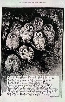 In December 1881, Wain's first drawing to be published appeared in the Christmas 1881 issue of the Illustrated Sporting and Dramatic News. It was a picture of bullfinches on laurel bushes, given the wrong title of "Robins Breakfast". The following year he was offered a position on the magazine and was able to give up his teaching position at the West London School of Art.[1]: 16