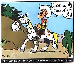 In the final panel of each story, except the earliest, Lucky Luke rides off alone on Jolly Jumper into the sunset, singing (in English) "I'm a poor lonesome cowboy, and a long way from home...". Luke first said this line in 1949 and it became a tradition afterwards. The song itself is based on a real life cowboy song, collected by John Lomax in Cowboy Songs and Other Frontier Ballads. [9]