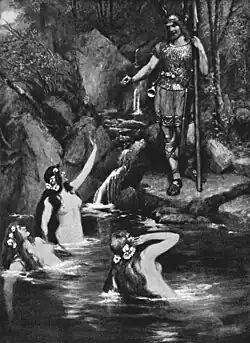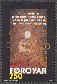 Andvarinaut is the name of a ring at the center of the narrative in Germanic works such as the Middle High German Nibelungenlied and the Icelandic Völsunga saga. It eventually becomes the property of the hero Siegfried or Sigurð. In the Völsunga saga, it is a gold ring that the dwarf Andvari cursed when Loki stole it from him by force, for weregild to pay to the killed Óttar's bereaved father Hreiðmarr, who was also father to Fáfnir.[2](pp 29, 80–82) After killing the rest of his family for the ring, Fáfnir transformed into a worm, and was later killed by Sigurð, who took Andvarinaut, and so inherited its curse. How Andvarinaut came to be cursed is explained in detail in Völsunga saga,[2] as is the elaborate sequence of events of how the curse plays out for Sigurð, involving Sigurð changing shapes with his brother-in-law Gunnar.[16] However, what magical use Andvarinaut might have to make it desirable is never specifically given in the narrative: The curse on it is simply a source of disaster for every person who owns it; its principal characteristic in the story is that nearly everyone wants to get it, except Sigurð, who has got it, but does not understand what it is that he's got.[2]