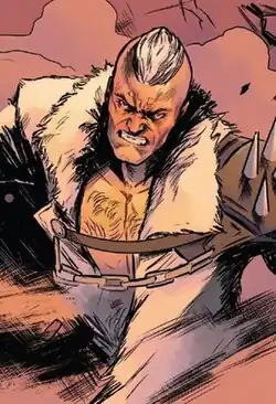 Mahkizmo is the ruler of Earth-74101 in the 23rd century, where men enslaved women. His timeline is the thematic opposite of Thundra's universe, where the women subjugated the men. The two come into conflict when Thundra travels to the 20th century of Earth-616 to change the past and prevent Machus from existing. Mahkizmo sentenced Thundra and the Fantastic Four to gladiatorial combat before being killed in an energy explosion when Thundra and the Thing punch him at the same time.[2] This also merges his and Thundra's universes of Machus and Femizonia.
