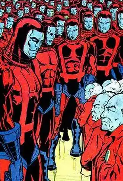![]() The Manhunters as depicted in History of the DC Universe #1 (January 1987). Art by George Pérez. | |