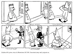 Started in 1928, Marmittone ("rooky") is derived from the "marmitta", the huge pot in which the military rations are cooked.[1] The main character is a simple-minded soldier and of good will who, for his gaffes or simply for misfortune, goes to prison at the end of any adventure.[1] The comic strip was published by Il Corriere dei Piccoli until 1940, a few weeks before the outbreak of World War II.[1]