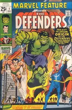 The first series was published for twelve issues from December 1971 until November 1973.[2] The lead story in Marvel Feature #1, by writer Roy Thomas and artist Ross Andru, featured the first team-up of the Hulk, Doctor Strange, and Namor as the Defenders.[3] The first two issues of Marvel Feature were in the 52-page format, with the remaining pages filled out by a new Doctor Strange solo tale and a Sub-Mariner reprint.[1] The Defenders continued as the stars of Marvel Feature for two more issues and then received their own self-titled series in August 1972.