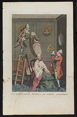 The Darlys' shops, some of the first to specialize in caricature, initially concentrated on political themes in the 1750s, at a time of political crises, but then focused on world of fashion.[13] "They seem to have been shrewd business people, changing their output in response to the fashion of the day."[14] Their etchings and engravings included "Wigs" (12 October 1773), "The Preposterous Head Dress, or the Featherd Lady" (20 March 1776), "Phaetona or Modern Female Taste" (6 November 1776); "Miss Shuttle-Cock" (6 December 1776); and "Oh. Heigh. Oh. Or a View of the Back Settlements" (9 July 1776), a play on words that refers to Ohio Country.[15]