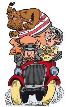 The comic consists in a zany parody of Albert Robida's Saturnin Farandoul[1][4] mixed with elements of the film The Great Race starring Jack Lemmon and Tony Curtis. It tells of Marzolino Tarantola, an adventurous, snob nobleman of British origins who takes part to the San Francisco-Paris car rally accompanied by the faithful butler Alfred and by Enrico l'Equipaggio (Henry the crew), a hulking speech-impaired man that solves any kind of problem.[2][5]