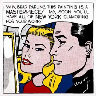 Masterpiece is regarded as a tongue-in-cheek joke that reflects upon Lichtenstein's own career.[5] In retrospect, the joke is considered "witty and yet eerily prescient" because it portended some of the future turmoil that the artist would endure.[7] In the painting, the blonde woman's speech bubble, "Why, Brad darling, This painting is a masterpiece! My, soon you'll have all of New York clamoring for your work!" conveys her remark as she gazes at the painting, of which a corner of the back is shown. Silent Brad conveys his agreement by his facial expression.[9] Adrian Searle of The Guardian says that the 1962 work, whose narrative and graphical content were both borrowed, was timely because Lichtenstein had his first exhibition in New York City at Leo Castelli Gallery that year, making the painting aspirational in an ironic way that comments on success and "the socio-sexual status of the hot young artist".[9] The satirical commentary on Lichtenstein's career, followed the inside joke made the year before in Mr. Bellamy.[12] According to Roberta Smith of The New York Times, Masterpiece was one of Lichtenstein's works created in a way that produced "faint and uneven" Ben Day dots.[13]