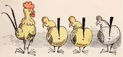The boys tie several crusts of bread together with thread, and lay this trap in the chicken yard of Bolte (or "Tibbets" in the English version), an old widow, causing all the chickens to become fatally entangled.
