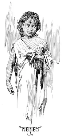 Born Jeanne Jacot, the daughter of French general Armand Jacot, Meriem is taken captive by Arabs as a child; they give her the name by which she is subsequently known. She is later rescued from her captors by Korak, the son of Tarzan, with whom she afterwards lives in the jungle. She is beautiful, strong, athletic, brave, daring and sensitive. She will kill for survival instead of sport. The emerging relationship between the two feral teenagers is described sensitively, as the embittered boy and the abused girl learn to live and love together, saving each other from various dangers and drawing to the happy ending in which Meriem marries Korak and is reunited with her father who reveals that she is a "princess in her own right".