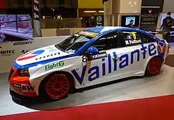 Many real cars were adapted from automobile designs from the series. Cars bearing the logo Vaillante ran in Le Mans in 1997 and 2003: A Courage in 1997, while in 2003, Vaillante cars have been designed to be used in the Luc Besson's movie.[20] Some fans have built a real Vaillante Grand Defi, a model which appeared several times in the comics series. The car has participated in real races, under the brand Vaillante.[21] A model was marketed in Belgium, the Honda Civic Vaillante, of which 50 models have been produced.[22] Automobile designer Luc Donckerwolke (current designer of Lamborghini, previously of SEAT) has drawn his inspiration from cars drawn by Jean Graton to design some real car models.[23] He also designed the SEAT Ibiza Vaillante, exhibited at the Geneva Motor Show in 2006.[24] It was also Luc Donckerwolke who transformed a Lola B98/10–Judd into a Vaillante and a Panoz LMP-1 Roadster-S into a Leader car in 2003 for the Besson movie.[25] Donckerwolke also collaborated with Studio Graton on the latest titles of the series, drawing some cars featured in the albums.[26]