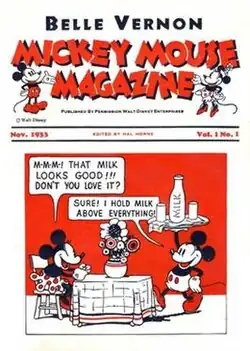 The first version of Mickey Mouse Magazine ceased publication with the September 1933 issue, and two months later, the second version launched in November 1933 as a promotion for dairies. The new series looked very much the same as the previous magazine, but had the name of a local dairy printed on the cover, and vigorously promoted the benefits of milk consumption.[1] The magazine was distributed door-to-door by milk delivery drivers.[7] 24 issues were published between November 1933 and October 1935.[1]