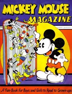 Mickey Mouse Magazine is an American Disney comics publication that preceded the popular 1940 anthology comic book Walt Disney's Comics and Stories. There were three versions of the title – two promotional giveaway magazines published from 1933 to 1935, and a newsstand magazine published from 1935 to 1940. The publication gradually evolved from a 16-page booklet of illustrated text stories and single-page comic panels into a 64-page comic book featuring reprints of the Mickey Mouse and Donald Duck comic strips.[1]