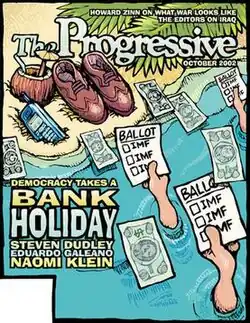 His cover art for the October 2002 edition of The Progressive magazine was his first for a national magazine.[1] Flugennock was a member of the editorial board of DC Indymedia through April 2009.