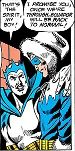 Minister Blizzard is a fictional character appearing in DC Comics publications and related media, commonly as a recurring adversary of the superhero Wonder Woman.[1] A would-be world conqueror from a hidden Arctic civilization, he debuted in 1948 in Wonder Woman #29, written by an uncredited Joye Hummel Murchison and illustrated by Harry G. Peter.[2] One of two members of Wonder Woman's rogues gallery introduced in the 1940s to have an ice/snow motif, Minister Blizzard (after the Blue Snowman, who first appeared three years prior), was an early progenitor of the comics trope of the ice-gun wielding supercriminal,[3] preceding more recognizable DC Comics antagonists such as Mr. Freeze and Captain Cold, as well as Marvel Comics' Blizzard.