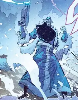 Minister Blizzard carries a gun that fires a beam capable of instantly freezing anything it hits, as well as spontaneously generating enormous amounts of ice, snow and cold. In his earliest appearances, his gun produced a "mind-paralysis ray" which could effectively "freeze" cognition and motor responses, as well as scramble thoughts.[13] The Minister is capable of propelling himself through the air by using his gun to materialize ice slides which rapidly form beneath and behind his feet, similar to the Marvel Comics mutant superhero Iceman. Additionally, the gun appears to be able to formulate moving constructs made of ice and vapor, not unlike the hydrokinetic abilities of the DC Comics superhero Mera.
