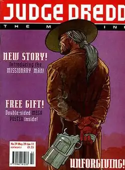 Missionary Man is British comic strip. It debuted in the Judge Dredd Megazine in May 1993 with the introductory 7-page story "Salvation at the Last Chance Saloon", illustrated by Frank Quitely. It established that tall Preacher Cain rides the Cursed Earth performing "special sermons" in the radiation-poisoned towns, tutoring the damned with a bible and his guns. In this first outing, having educated and decimated a table of gambling mutant heavyweights he rides into the sunset, tossing a bible at the surviving townspeople - which contains a thermonuclear explosive.