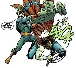 Around the same time during the fight with Mordru, Mr. America helped his team in the fight against the Black Lanterns in New York City. He expressed willpower as he fought against a Black Lantern. Mr. America growled to it, "Come on, you monster". He was later seen defeated and being held by Flash, who sped him to safety at S.T.A.R. Labs.[12]