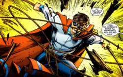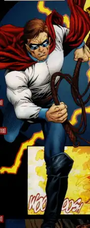 After Jeremy's infiltration, the Justice Society decided to split into two teams. Mr. America stayed on the regular JSA team. Mr. Terrific, who was alive and was recovering from his injuries, gave Mr. America his whip, saying he made some improvements on it. When Mr. America, along with Lightning at his side, tried his whip out by striking it on some cinder blocks, they exploded, with the impact knocking both of them a few feet back.[11] At the same time, Mr. America soon helped his team defeat Mordru and then later The Fourth Reich, a Nazi team associated with Jeremy.
