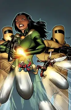 ![]() Monica Rappaccini alongside A.I.M. troops as seen on the textless cover of Ant-Man & Wasp #3 (January 2011). Art by Salva Espin and Guru-eFX. | |