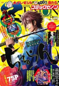 After a certain amount of chapters are serialized in the magazine they are collected into tankōbon format and published under the Zenon Comics imprint. Parallel to this label, there is Zenon Comics DX that only publishes titles former released by other publishers such as Tetsuo Hara's Cyber Blue (Weekly Shōnen Jump) and Kōkenryoku Ōryō Sōsakan Nakabō Rintarō (Bart 3230). This two titles composed Zenon Comics DX first line-up, while Zenon Comics one had Angel Heart: 2nd Season, Cat's Eye, Concierge Platinum, and Waraenu Warashi: 108 no Karma.[15] Both imprints released its first titles on March 22, 2011.[note 1] The Zenon Comics level also publishes manga released on Zenon's sister magazine, Web Comic Zenyon (WEBコミックぜにょん).[22] Published online since October 25, 2012,[23] it is the home of series such as Hokuto no Ken: Ichigo Aji and Seikai Suru Kado: Aoi Haru to Railgun.[24][25]