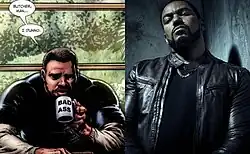 ![]() Mother's Milk as depicted in the comic book series (left; as Baron Wallis) and portrayed in the television series (right; as Marvin T. Milk) by Laz Alonso. | |