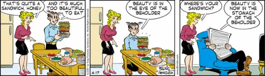 - ↑ In a 2017 comic strip concerning Facebook messages, Dagwood admits to Blondie that he broke a high-school dating girl's heart-by accidentally eating her restaurant food!