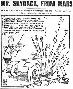 Mr. Skygack, from Mars was a comic strip by the American cartoonist A. D. Condo. It appeared in the Chicago Day Book, a Chicago working-class newspaper, from October 2, 1907, to April 1911[1] in about 400 comic strips and single panels.[2] Like much of Condo's work in this period, the Mr. Skygack feature was syndicated and appeared in many other papers, including The Seattle Star,[3] The Milwaukee Journal, The Spokane Press, The Pittsburgh Press, The Tacoma Times and The Duluth Daily Star.