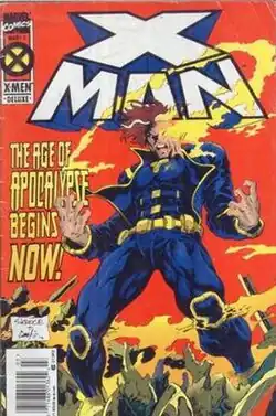 X-Man is an alternate version of the regular Marvel Universe hero Cable, hailing from the alternate timeline Earth-295, first established in the "Age of Apocalypse" storyline.[1] He is the biological son of his dimension's Scott Summers and Jean Grey, born of genetic tampering by Mr. Sinister. His first name is derived from his creator's (Mr. Sinister's) real name, Nathaniel Essex, and his last name from his genetic mother, Jean Grey.[2] Due to not being infected by a techno-organic virus, as Cable was, Nate achieved vast telepathic and telekinetic powers (reflecting those that Cable would have had without the virus), and was one of the most powerful mutants in existence during his lifetime.