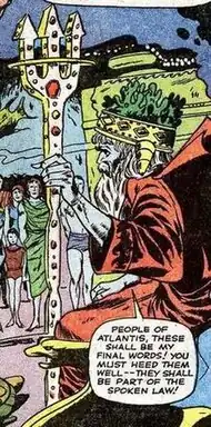 In modern times, Neptune sent Namor the Sub-Mariner on a quest for his trident in order to regain the Atlantean throne, appearing before him at various points.[2] Neptune then appeared to the Atlanteans, and decreed Namor the true ruler of Atlantis.[3] Neptune later advised Namor of the true destiny of Atlantis.[4] Later, Neptune healed a wounded Namor, and transformed a drowning stallion into a giant seahorse.[5]