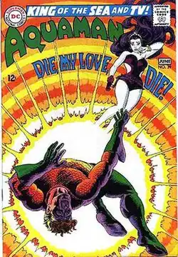 From 1962 to 1968, he drew the first 39 issues of Aquaman, whose character had previously starred in a backup feature in Adventure Comics, and all its covers through the final issue (#56, April 1971).[6] He recalled that, "Ramona Fradon had been drawing the character but was moving on for some reason. I remember being in [editor] Murray's [Boltinoff] office with Ramona during the transition. ... Anyway, they must have liked my work because when the character got his own series, they made me the artist".[11] Among the Aquaman stories which Cardy drew were issue #18 which featured the wedding of Aquaman and Mera[12] and #23 which saw the birth of the couple's son.[13] Aquagirl was introduced in issue #33 (June 1967) by Cardy and writer Bob Haney.[14]