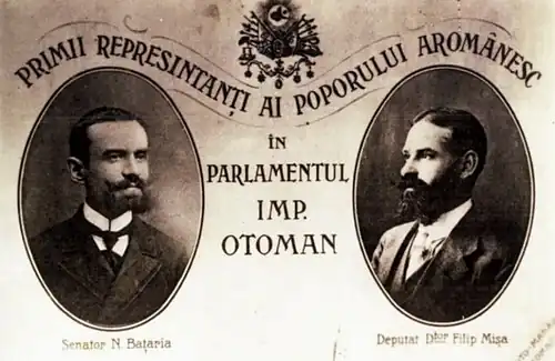 In July 1908, the Aromanian intellectual was propelled to high office by the Young Turk Revolution and the Second Constitutional Era. Days after the events, he visited Constantinople (now Istanbul) as the main delegate of an Aromanian congress from Üsküb. He was personally welcomed by Djemal, Cavit Bey, and Enver, then addressed the crowds gathering in Freedom Square; his twin speeches, in Ottoman Turkish, French and Aromanian, proclaimed an era of "freedom and safety" for all Ottoman subjects.[50] Batzaria was a candidate for the Third Chamber of Deputies; ahead of elections in December, he toured Macedonia, being welcomed by the Aromanians of Veria and Xirolivado, but also by the Megleno-Romanians—including the Muslim ones of Notia.[51] The Young Turk party ultimately rewarded his contribution, legally interpreted as "high services to the State", by assigning him a special non-elective seat in the Ottoman Senate (a status similar to that of another Aromanian Young Turk, Filip Mișea, who served in Chamber).[52] As Zbuchea notes, Batzaria was unqualified for the office, as he was neither forty years old nor a distinguished bureaucrat, and only owed his promotion to his conspiratorial background.[53] In early 1909, Nicolae Tacit was assigned to replace him as inspector.[54]