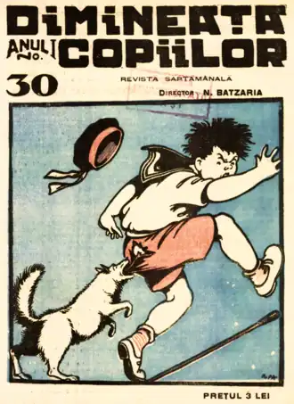 Batzaria's work in children's literature, taking diverse forms, was often published under the pen names Moș Nae ("Old Man Nae", a term of respect applied to the hypocorism of Nicolae) and Ali Baba (after the eponymous character in One Thousand and One Nights).[19][111] Another variant he favored was Moș Ene,[112] alongside Dinu Pivniceru and N. Macedoneanu.[19] By 1925, Batzaria had created the satirical character Haplea (or "Gobbles"), whom he made into a protagonist for some of Romania's first comic strips.[68][113][114][115] A Christmas 1926 volume, comprising 73 Haplea stories, was welcomed at the time as one of the best books for children.[116] Other characters created by Batzaria in various literary genres include Haplina (the female version and regular companion of Haplea), Hăplișor (their child), Lir and Tibișir (known together as doi isteți nătăfleți, "two clever gawks"), and Uitucilă (from a uita, "to forget").[117] The graphics to Batzaria's rhymed captions were provided by caricaturist Marin Iorda, who also worked on a cinema version of Haplea (one of the first samples of Romanian animation).[68][115][118] It was a compendium of the Dimineața comics, with both Iorda and Batzaria (the credited screenwriter) drawn in as supporting characters.[115] Premiered in December 1927 at Cinema Trianon of Bucharest, it had been in production for almost a year.[115]
