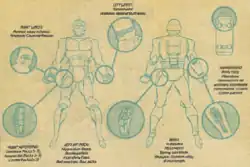 The wrist gauntlets on his armor could fire pepper spray, sleeping gas or explosively launch his "Battle Staves" which were holstered alongside his forearms in the Mark II armor. His gauntlets could also deploy pneumatically-fired grapnel lines for traversing rooftops, and contained retractable blades and an extendable computer tap. He also had a utility pack with various shaped explosives, plastique, napalm gel, and cordite packs, magnesium flares, smoke capsules, incendiary packs, caltrops/spur jacks, and ball bearings. The back pack also contained a glider chute. The Mark II armor also had an advanced active camouflage system.