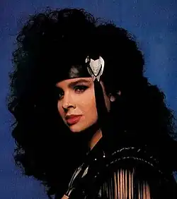 Tavares made an impromptu visit to Marvel headquarters soon afterwards (posing for pictures with Dutter) and was hugely impressed with Lee's sketches; knowing little of the comic industry, she was reportedly perplexed and disappointed to find Lee wouldn't be drawing the comic itself due to his commitments on the best-selling Uncanny X-Men. Instead the art for the special itself was provided by Denys Cowan and Jimmy Palmiotti. Both Dutter and Budiansky would recall Tavares as a very pleasant person, but felt she was heavily controlled by Kessler.[1] A costume based on Lee's design was created for Tavares to wear on promotional appearances.[5] Lee and the in-character Tavares made several promotional appearances, including on television shows such as ABC's Into the Night With Rick Dees, Dance Party USA and The Party Machine with Nia Peeples.[1]