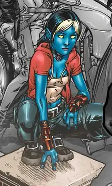 She also suffered a stroke while on the team.[16] She suffered aftereffects, such as hemiparesis, partial memory loss, and aphasia, but was making great strides towards recovery.[17] Despite this, while only partially recovered, she was able to save numerous civilians in the battle against Albion by possessing one of Albion's evil Captain Britains. She was recently reunited with the Exiles, including her lover Thunderbird who is no longer comatose.[18] However, her return to the Exiles is short, because after defeating Mad Jim Jaspers, Nocturne and Thunderbird leave to help their relationship grow and to help Nocturne recover.[19] Along with Blink, they go to Heather's reality so she can monitor her health.