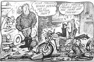 Permanently acne-ridden and runny-nosed, Malcolm is Ogri's utter antithesis; a bumbling incompetent whether riding or maintaining his bike (originally Lunge, a blue Triumph pre-unit twin of 1960s vintage),[5] attempting to charm the opposite sex, or indeed even the most routine and uncomplicated task. His blunders are many and varied. Once he designed a revolutionary means of supercharging his bike's engine by feeding the exhaust gases back into the intake. Another time he used a whole-body plastic bag to keep the rain off (and nearly suffocated a few minutes later). He has ridden round a race-track in the wrong direction, and collided with Ogri (Malcolm's boundless incompetence versus Ogri's massive adequacy is a classic encounter between the irresistible force and the immovable object); he has borrowed Ogri's bike to ride around a race-track and fallen off through following the map of another course. Ogri once gave Malcolm a handful of engine parts to de-grease; he dropped them into a bath of caustic soda, unaware that the chemical dissolved aluminium. He gave him most of an engine to de-coke; Malcolm put it in the washing machine, destroying both the engine and the washing machine. And testing the spark from his spark-plug at the same time as checking the petrol in his tank led to a predictable conflagration that Ogri at once recognised as Malcolm's handiwork from at least a mile away.