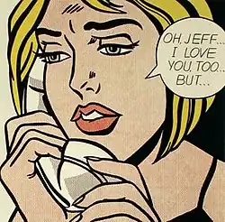 In the early 1960s, Lichtenstein produced several "fantasy drama" paintings of women in love affairs with domineering men causing women to be miserable, such as Drowning Girl, Hopeless and In the Car. These works served as prelude to 1964 paintings of innocent "girls next door" in a variety of tenuous emotional states such as in Oh, Jeff...I Love You, Too...But....[7] Using only a single frame from its source, Oh, Jeff...I Love You, Too...But...'s graphics are quite indicative of frustration, but the text in the speech balloon augment the romantic context and the emotional discord.[8] After 1963, Lichtenstein's comics-based women "...look hard, crisp, brittle, and uniformly modish in appearance, as if they all came out of the same pot of makeup." This particular example is one of several that is cropped so closely that the hair flows beyond the edges of the canvas.[9] This was painted at the apex of Lichtenstein's use of enlarged dots, cropping and magnification of the original source.[10] The tragic situations of his subjects makes his works a popular draw at museums.[3]