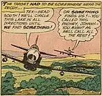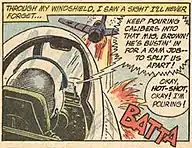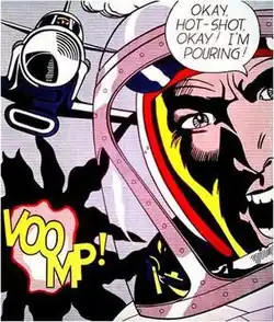 During the late 1950s and early 1960s a number of American painters began to adapt the imagery and motifs of comic strips. Lichtenstein made drawings of comic strip characters in 1958. Andy Warhol produced his earliest paintings using this style in 1960. Lichtenstein, unaware of Warhol's work, produced Look Mickey and Popeye in 1961.[1] Soon, Lichtenstein advanced from animated cartoons to more serious themes such as romance and combat depictions.[2] Lichtenstein said that at the time, "I was very excited about, and very interested in, the highly emotional content yet detached impersonal handling of love, hate, war, etc., in these cartoon images."[2] The work was inspired by five different comic book panels made by Russ Heath and Irv Novick.[3] The plane, the pilot, the text balloon and the graphic onomatopoeia, "VOOMP!", all come from panels from different comic books.[4]