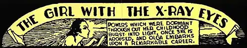 Olga Mesmer, "The Girl with the X-ray Eyes", starred in a single-page comic strip that ran in issues of the pulp magazine Spicy Mystery Stories cover-dated August 1937 to October 1938.[1] The first story, "The Astounding Adventures of Olga Mesmer, the Girl with the X-Ray Eyes", and subsequent installments are by an unidentified writer.[2] Art for the strip, created at a comics studio run by Adolphe Barreaux,[3] is credited to Watt Dell, who sometimes signed his illustrations for the magazine as Watt Dell Lovett, and may be a pseudonym; as well, some of the Mesmer strips are signed "Stone".[4]