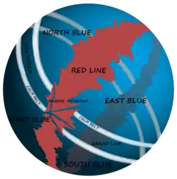 The surface of the Blue Planet mainly consists of the Blue Sea, two vast oceans divided by a massive continental mountain range called the Red Line.[Jp 3] Within the oceans is a second global phenomenon known as the Grand Line,[Jp 4] which is a sea that runs perpendicular to the Red Line and is bounded by the Calm Belt,[Jp 5] strips of calm ocean infested with huge ship-eating monsters known as Sea Kings.[Jp 6] These geographical barriers divide the world into four seas: North Blue,[Jp 7] East Blue,[Jp 8] West Blue,[Jp 9] and South Blue.[Jp 10] Passage between the four seas, and the Grand Line, is therefore difficult. Unique and mystical features enable transport between the seas, such as the use of Sea Prism Stone[Jp 11] employed by government ships to mask their presence as they traverse the Calm Belt, or the Reverse Mountain[Jp 12] where water from the four seas flows uphill before merging into a rapidly flowing and dangerous canal that enters the Grand Line. The Grand Line itself is split into two separate halves with the Red Line between being Paradise[Jp 13] and the New World.[Jp 14]