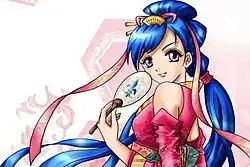 Yurika (pictured on the right), a fictional blue-haired teenage girl, serves as Otakuthon's mascot.[21] She appears under many forms on Otakuthon booklets, badges, website, clothing and other wearables. She was originally created for the convention by local artist Jessie Rong.[21] Yurika has been drawn by various artists over the years and a mascot contest was even once held.[54] Véronique Thibault, Yinyin Liu, Sharyl Chow and Meryem Bahnini were credited in the Otakuthon 2010 program booklet for different versions of the mascot. In 2011, Yurika was joined by her brother Yatsumi, her cousin Yuki, and her friend Yumi.[55]