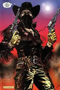 The Outlaw Kid was once described as the closest thing in the Old West to Spider-Man. He had a father who so disapproved of guns that the character created the Outlaw Kid, and would only use guns when he was The Outlaw Kid. In my version of it, he's gone a little bit over the edge, in that his father eventually found out, and the heart attack killed him, and he's devised the Outlaw Kid into a whole different personality. And in his regular personality, he thinks the Outlaw Kid is the killer, so he's hunting himself through the miniseries.[4]