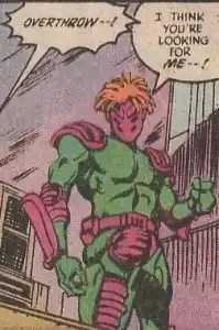 Overthrow was for some time living in the "supervillain" nation of Zandia, the former desmesne of Brother Blood's Church of Blood. Overthrow was part of Zandia's Olympic team, which was made up largely of supervillains.
