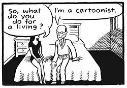 Between his encounters with sex workers are scenes of himself discussing and debating the issue with his friends, especially fellow cartoonists Seth and Joe Matt. Much of the humour in the book comes from the dialogue in these scenes.[9]