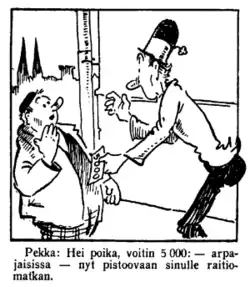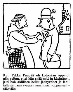 Pekka Puupää is a Finnish text comic and film character, created by Ola "Fogeli" Fogelberg. The character appeared 1925–1975 in the popular comic Pekka Puupää and 1952–1960 in thirteen films (Pekka ja Pätkä) produced by Suomen Filmiteollisuus. Pekka Puupää is one of the most well-known and beloved characters in the Finnish popular culture.