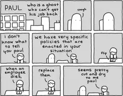 Pictures for Sad Children is a 2007 webcomic, created by Simone Veil.[1][2][3] The webcomic, about a ghost named Paul, featured a spare and minimalist black-and-white artstyle and depressive, nihilistic themes. In 2012, Veil launched a highly successful Kickstarter campaign to publish a print collection of the webcomic. However, Veil was not able to ship all of the copies to backers, and emails from fans asking when their book would arrive eventually led Veil to burn some of the books. She later stated that only unsaleable copies had been burned and that all backers who had paid at least fifteen dollars were sent their copy. After Pictures for Sad Children was taken offline in 2014, a fan community rose up to share pages and other content from the webcomic.