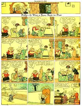 Polly and Her Pals is an American comic strip, created by cartoonist Cliff Sterrett, which ran from December 4, 1912, until December 7, 1958.[1] It is regarded as one of the most graphically innovative strips of the 20th century. It debuted as Positive Polly on December 4, 1912, in William Randolph Hearst's newspapers, initially the New York Journal, and was later distributed by King Features Syndicate.[2][3][4] The title changed to Polly and Her Pals on January 17, 1913.[1]