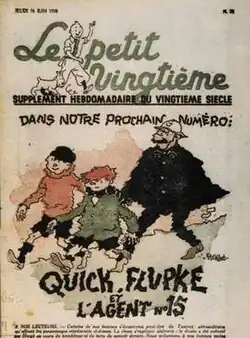 The exploits of Quick and Flupke (French: Quick et Flupke, gamins de Bruxelles, lit. 'Quick and Flupke, urchins of Brussels') was a comics series by Belgian cartoonist Hergé. Serialised weekly from January 1930 to 1940 in Le Petit Vingtième, the children's supplement of conservative Belgian newspaper Le Vingtième Siècle ("The Twentieth Century"), the series ran alongside Hergé's better known The Adventures of Tintin. It continued for one extra year in Le Soir Jeunesse until 1941.[1]
