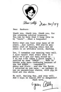 In 1984, When Van Buren sent a gift to "Dear Abby" columnist Abigail Van Buren (Pauline Phillips), she wrote back on November 30, 1984, thanking him and commenting on the name similarity: